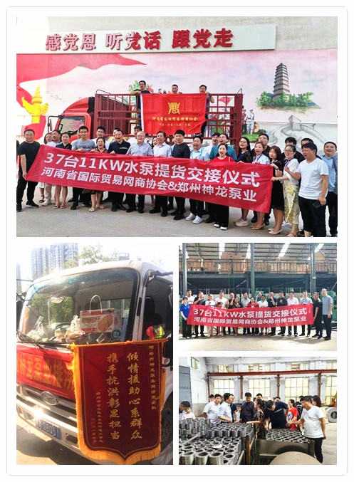 河南國際貿易網商協會、神龍泵業水泵提貨交接,未來路街道贈神龍排澇突擊隊錦旗