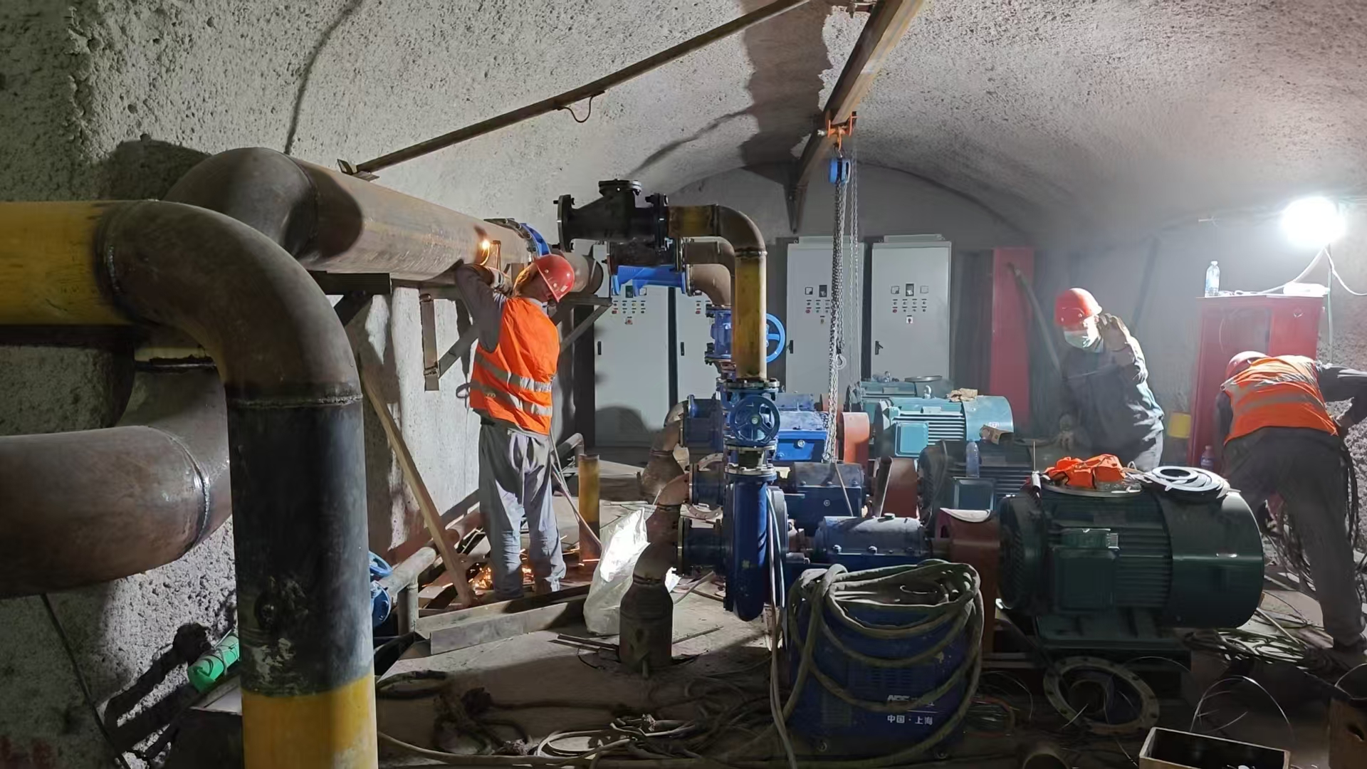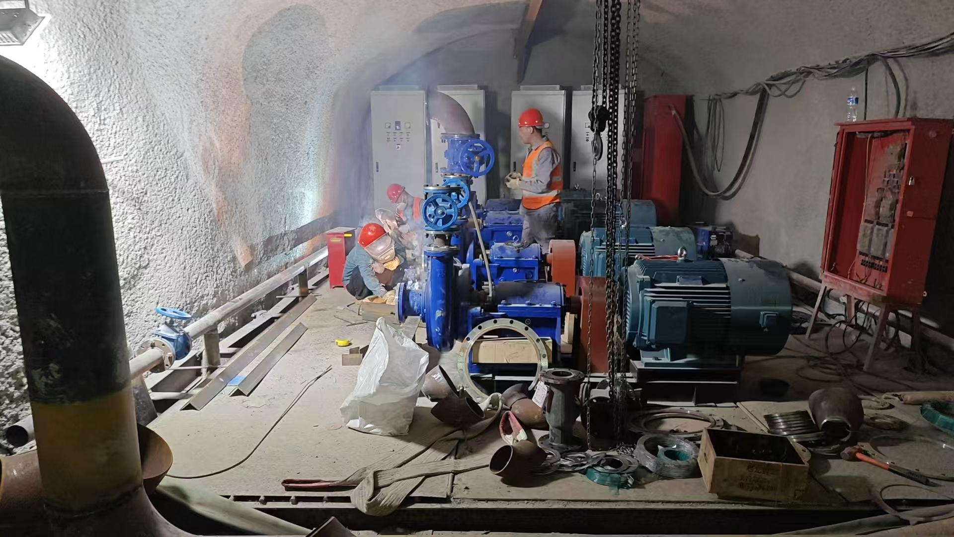 根據鐵路隧道的工程進度,第三批主排水泵已進場完畢,立即投入緊張的安裝工作。第三批主排水泵清水泵功率為90KW 4臺,污水泵功率為75KW 4臺,共計8臺,為不耽誤工程整體進度,安裝工作設備進場立即開始,預計將按期完成安裝工作,在端午節后開始調試。